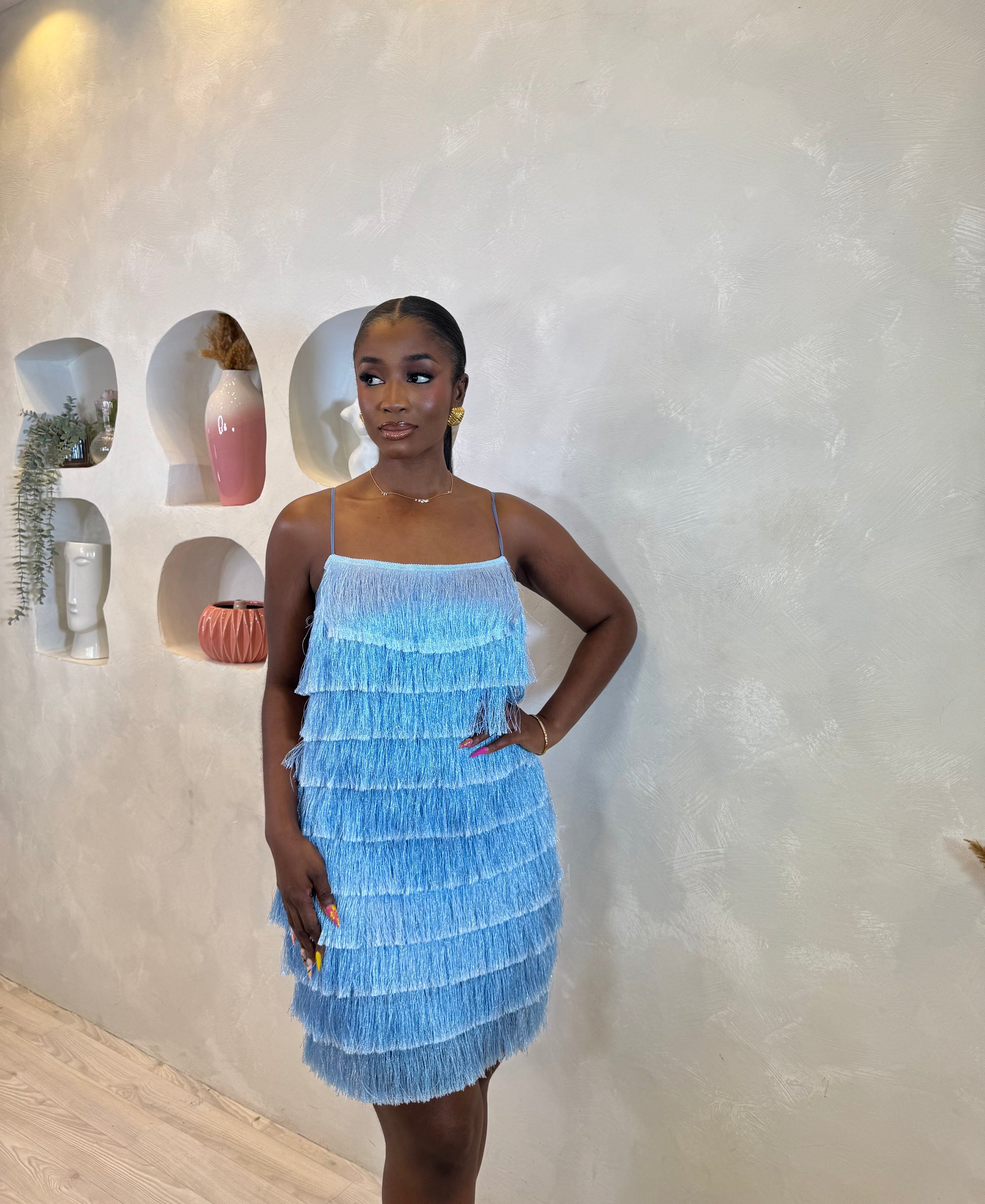 Dance the night away in the Blue Mirage Fringe Dress, designed with layered tiers of fringe that move beautifully with every step. Featuring delicate spaghetti straps and a flirty mini length, this dress is the perfect mix of fun and sophistication. Ideal for cocktail nights, parties, and celebrations where you want to shimmer with playful elegance.