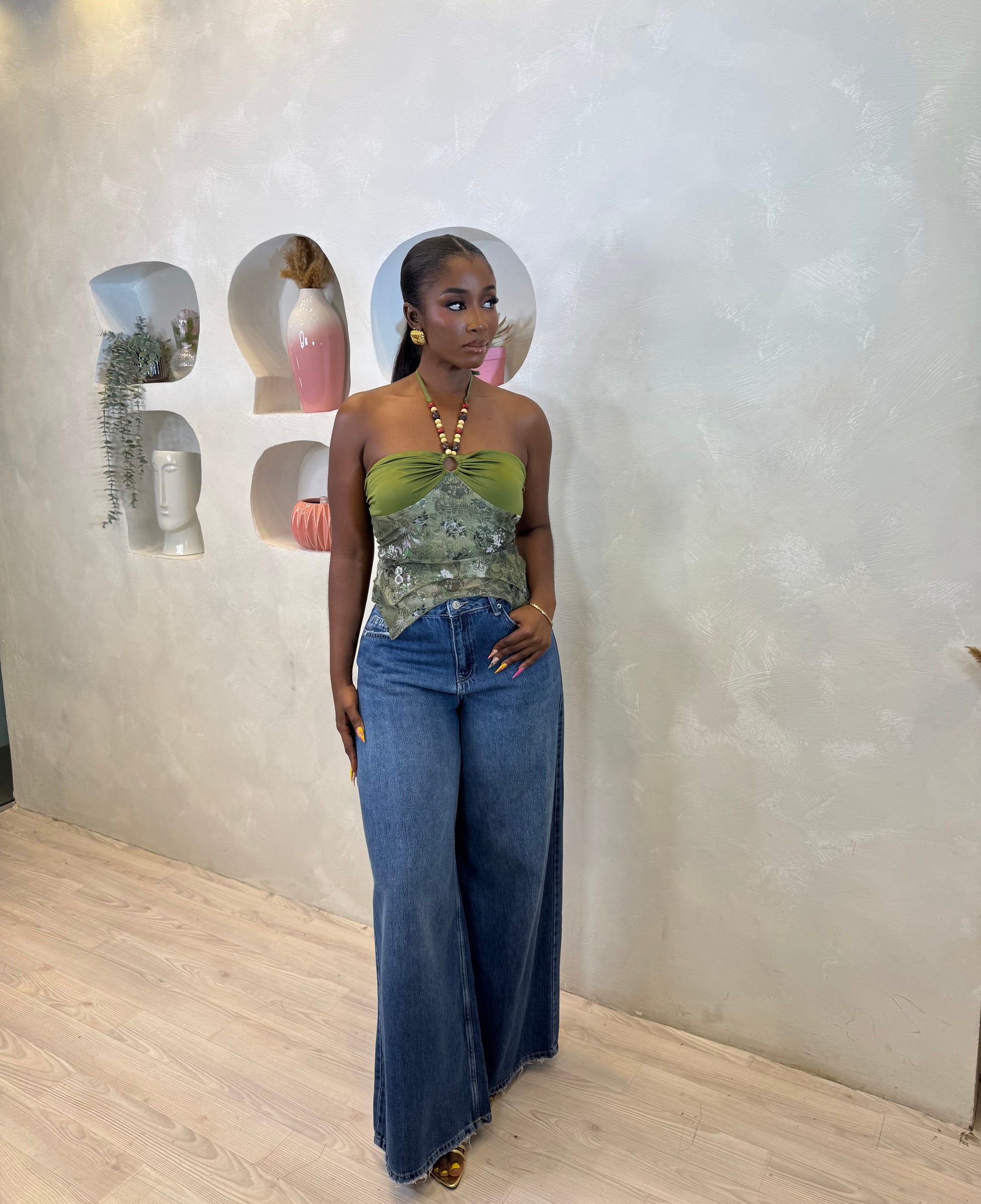 Channel effortless bohemian vibes in the Emerald Essence Beaded Halter Top. Designed with a beaded halter neckline, ruched bust detail, and a flowy handkerchief hem in earthy green tones, this top blends laid-back charm with modern femininity. Perfect for festivals, brunch dates, or casual nights out when you want a touch of boho elegance.