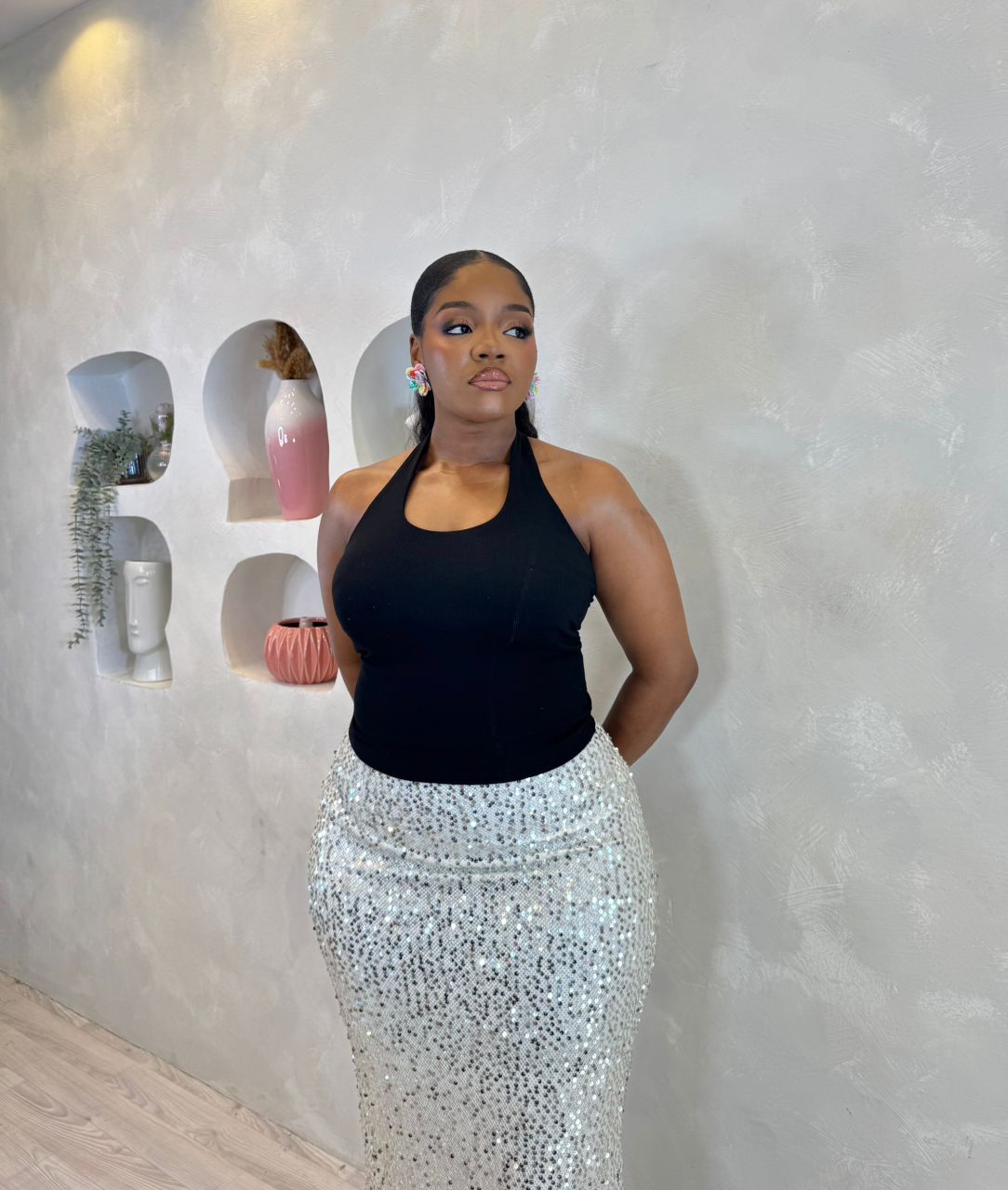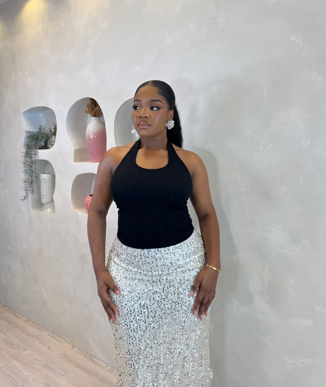 Product description: Keep it sleek and versatile with the Everyday Essential Halter Tank. Designed in a crisp white ribbed fabric, this top features a flattering halter neckline and fitted silhouette that pairs effortlessly with jeans, skirts, or layered looks. A timeless wardrobe staple you’ll reach for again and again—perfect for casual days, brunch outings, or layering under blazers for a chic edge.
