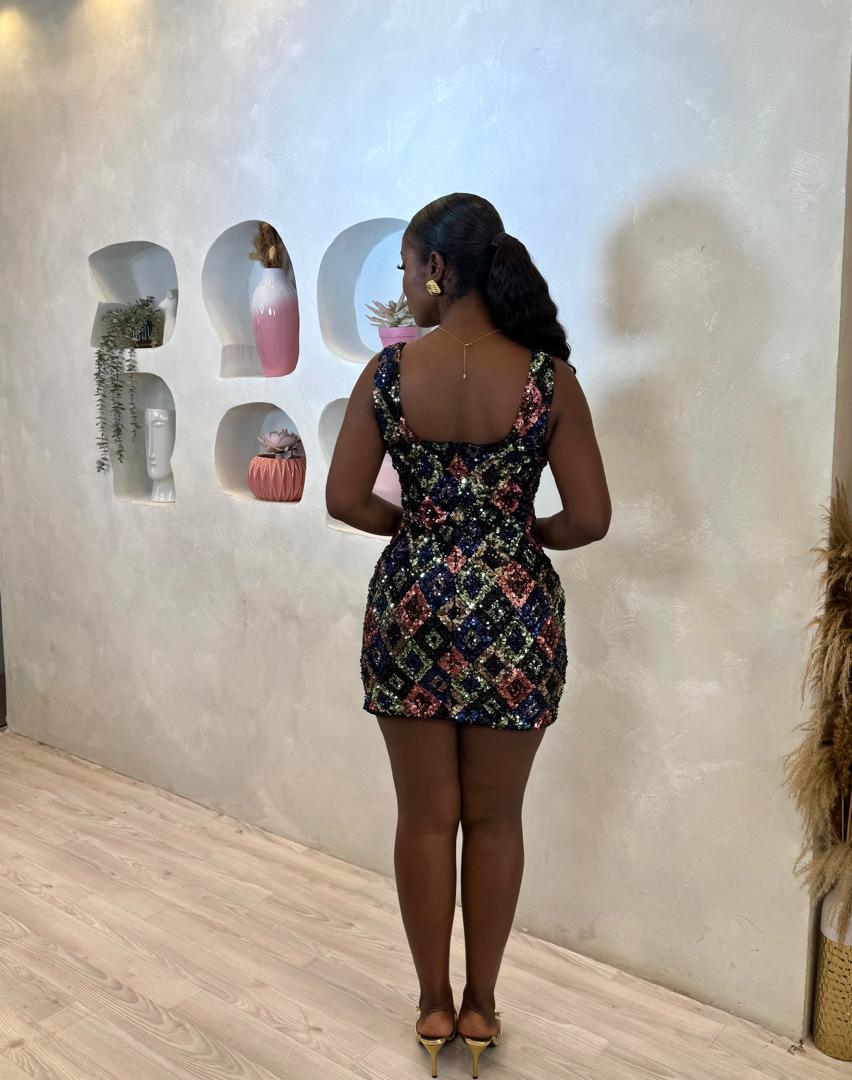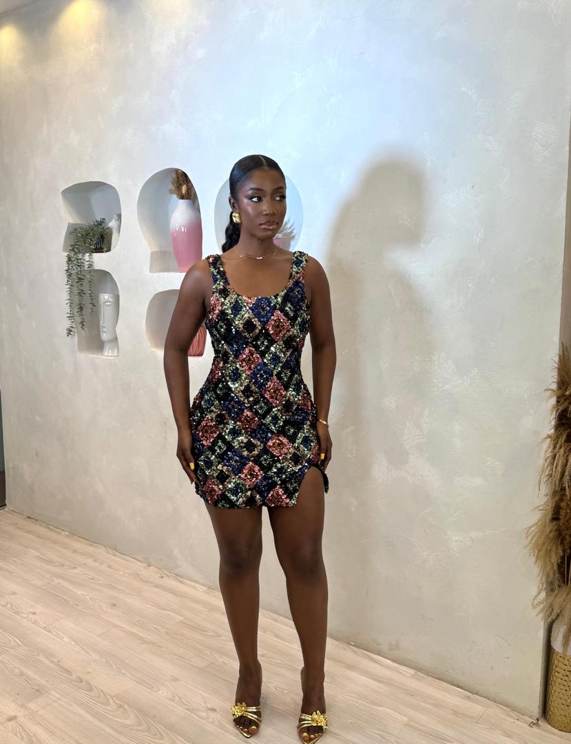 Dazzle in the Midnight Magic Sequin Mini, a show-stopping dress designed to make every entrance unforgettable. Crafted with multi-tone sequins arranged in a rich mosaic pattern, this mini hugs the body beautifully while catching the light from every angle. The sleeveless scoop neckline adds a touch of simplicity to balance the sparkle, while the subtle side slit brings a hint of allure. Perfect for birthdays, nights out, and every moment that calls for unmatched shine.