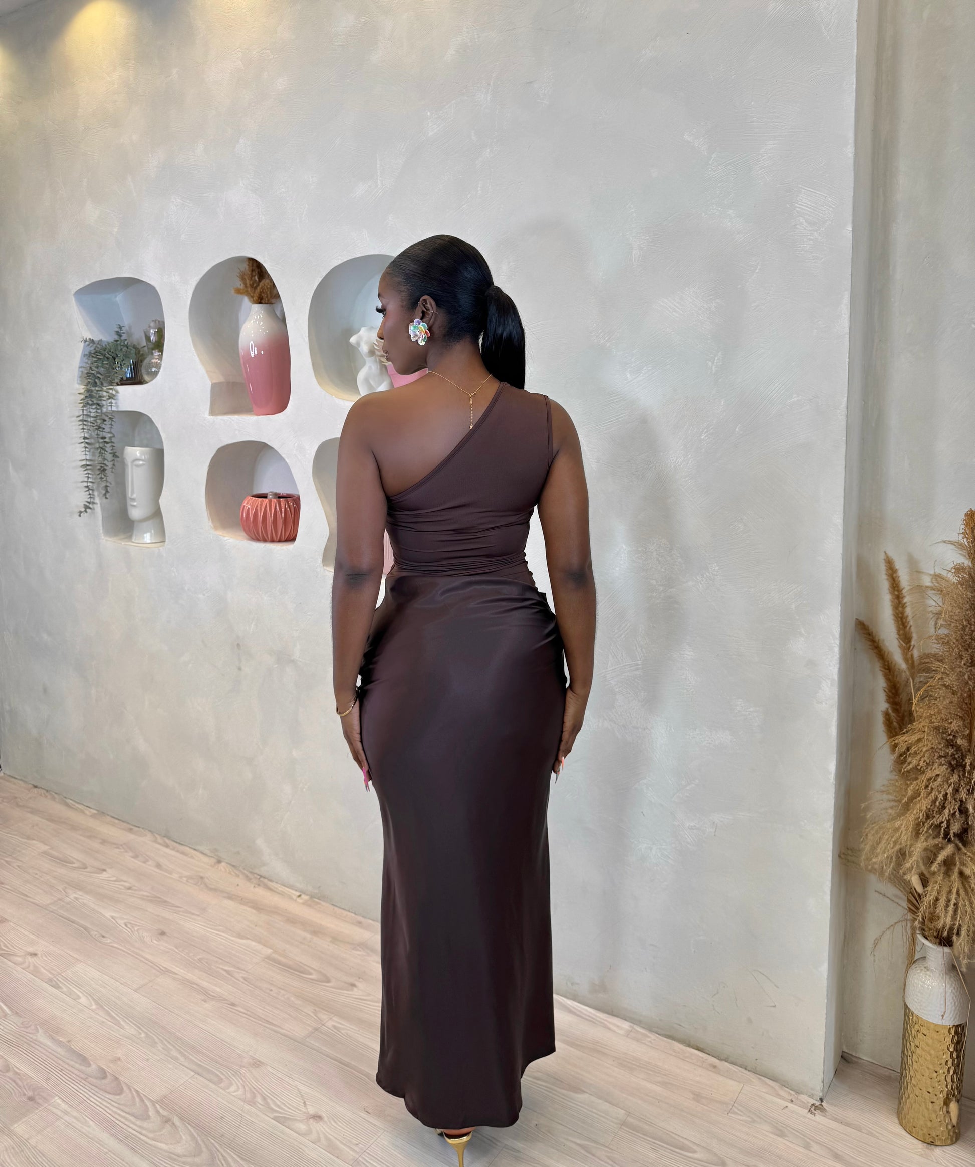 Turn heads in the Mocha Muse One-Shoulder Gown, a sleek silhouette crafted in a rich chocolate satin. Designed with an asymmetric neckline, subtle ruching at the hip, and a floor-grazing hem, this gown exudes timeless sophistication.