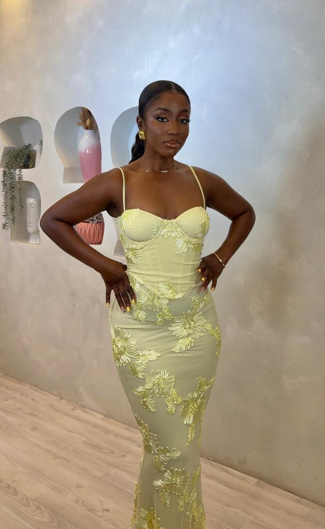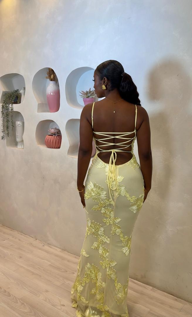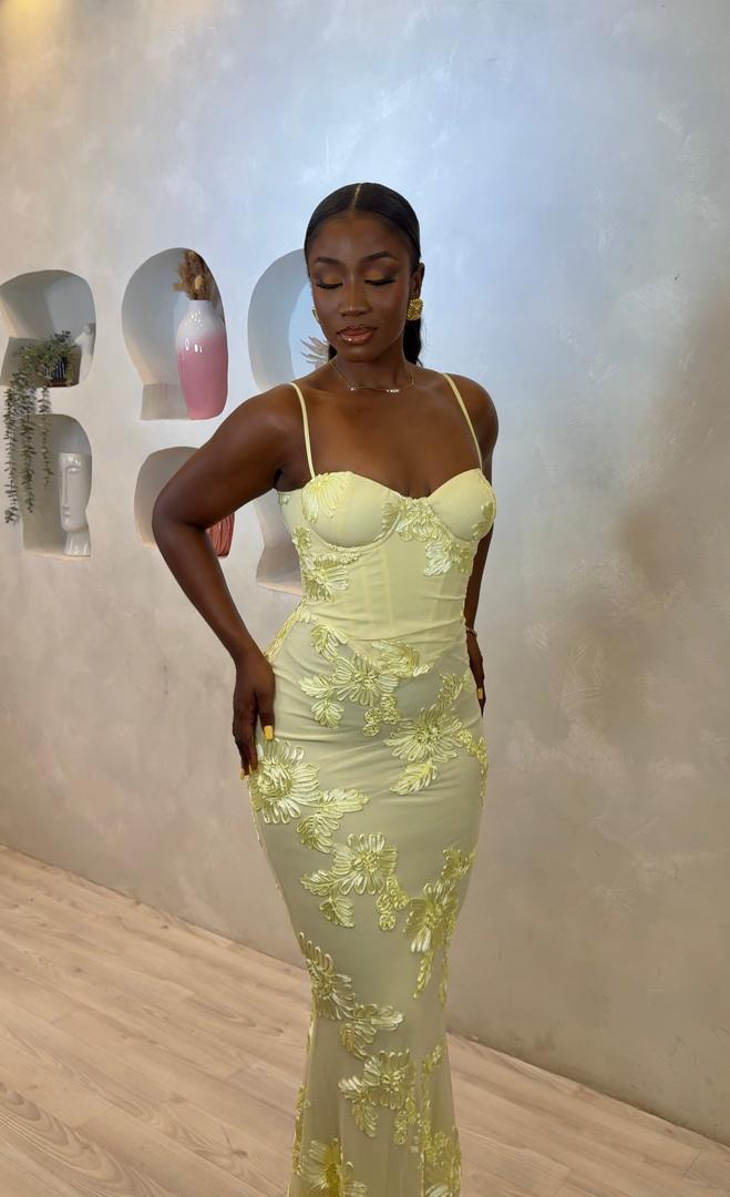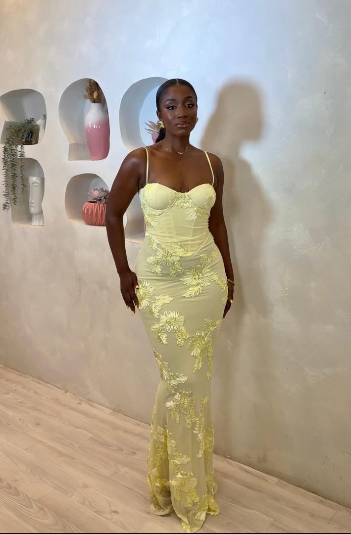 The entire dress is wrapped in soft lemon-yellow mesh embroidered with intricate floral appliqués that add texture, romance, and a luxurious finish. The silhouette hugs your figure before flowing into a graceful hem, giving you a dreamy, goddess-like look.