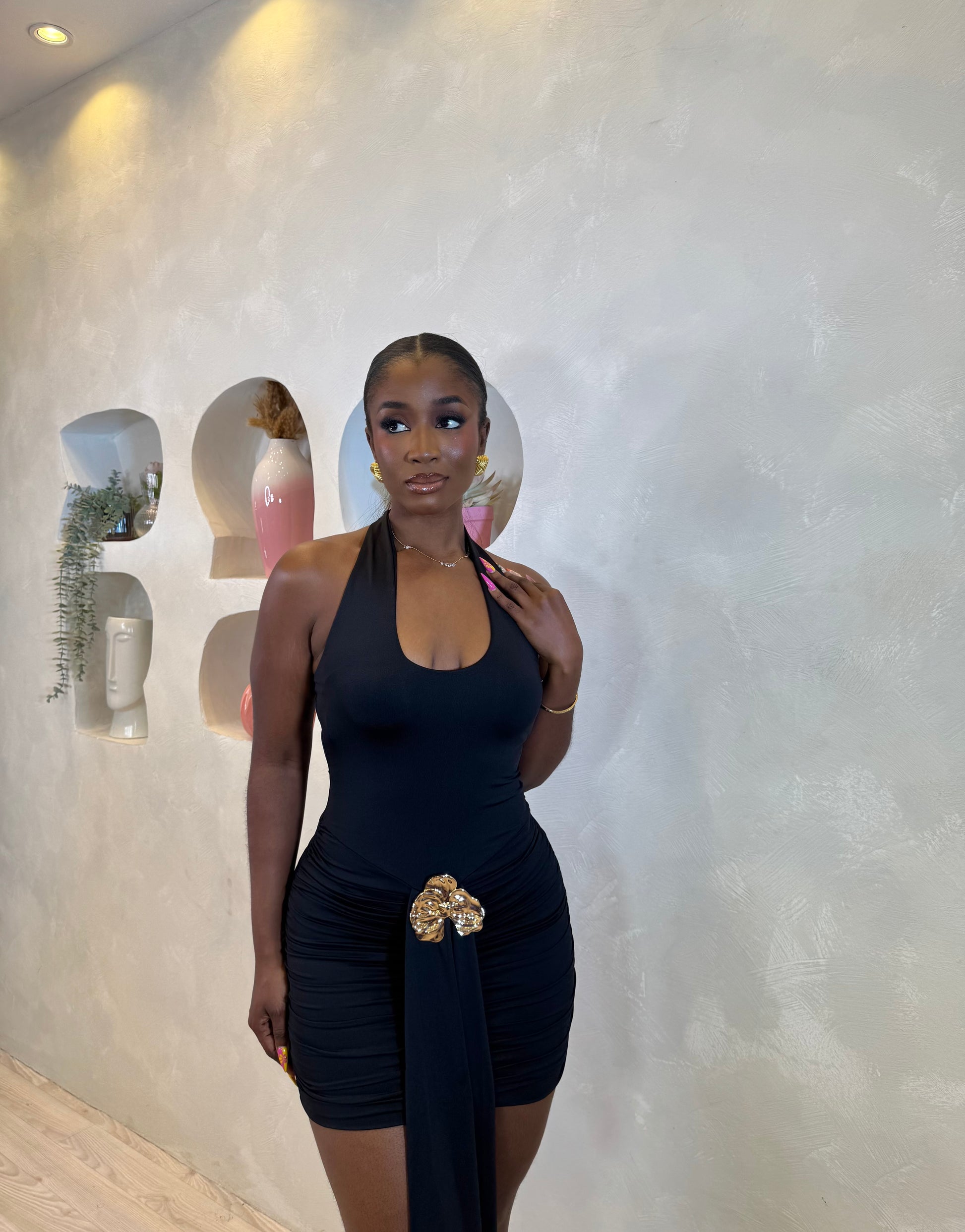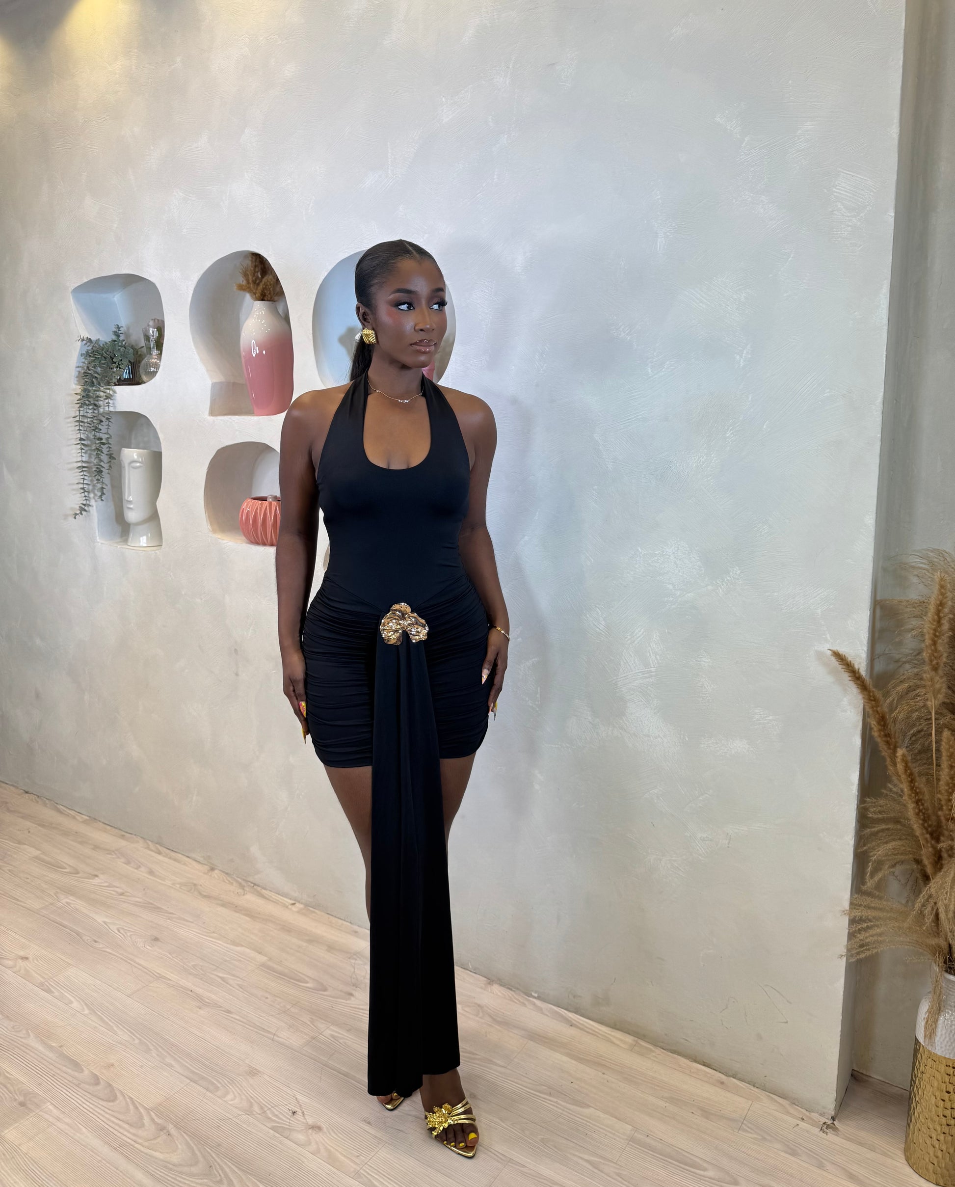 Command attention in the Midnight Luxe Draped Mini Dress, a daring halter design with ruched detailing and a statement front drape. Finished with an ornate gold embellishment at the waist, this figure-hugging mini blends sophistication with sultry allure. Perfect for luxe parties, or any night you want to own the spotlight.