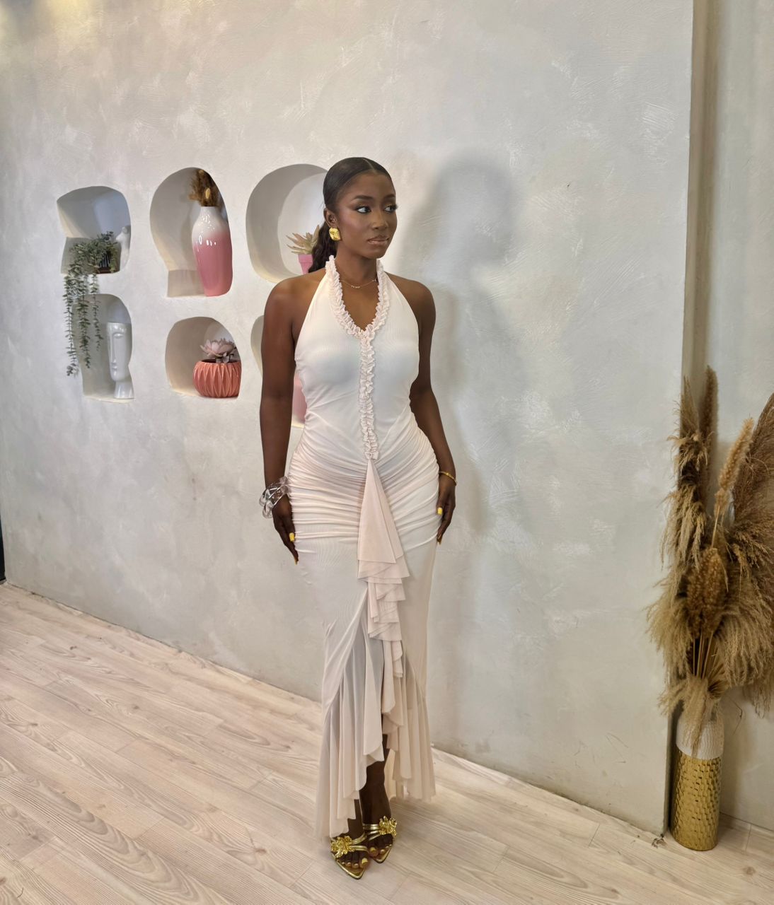 Over the moon gown designed to flatter every curve. Crafted in a luxe stretchy fabric, this dress features delicate ruffle detailing along the neckline and a cascading layered drape at the front for a romantic, flowing finish. The ruched hip design enhances your silhouette, while the high-slit effect adds movement and elegance. Perfect for weddings, special dinners, red-carpet moments, or any occasion where you want to look effortlessly refined and unforgettable.
