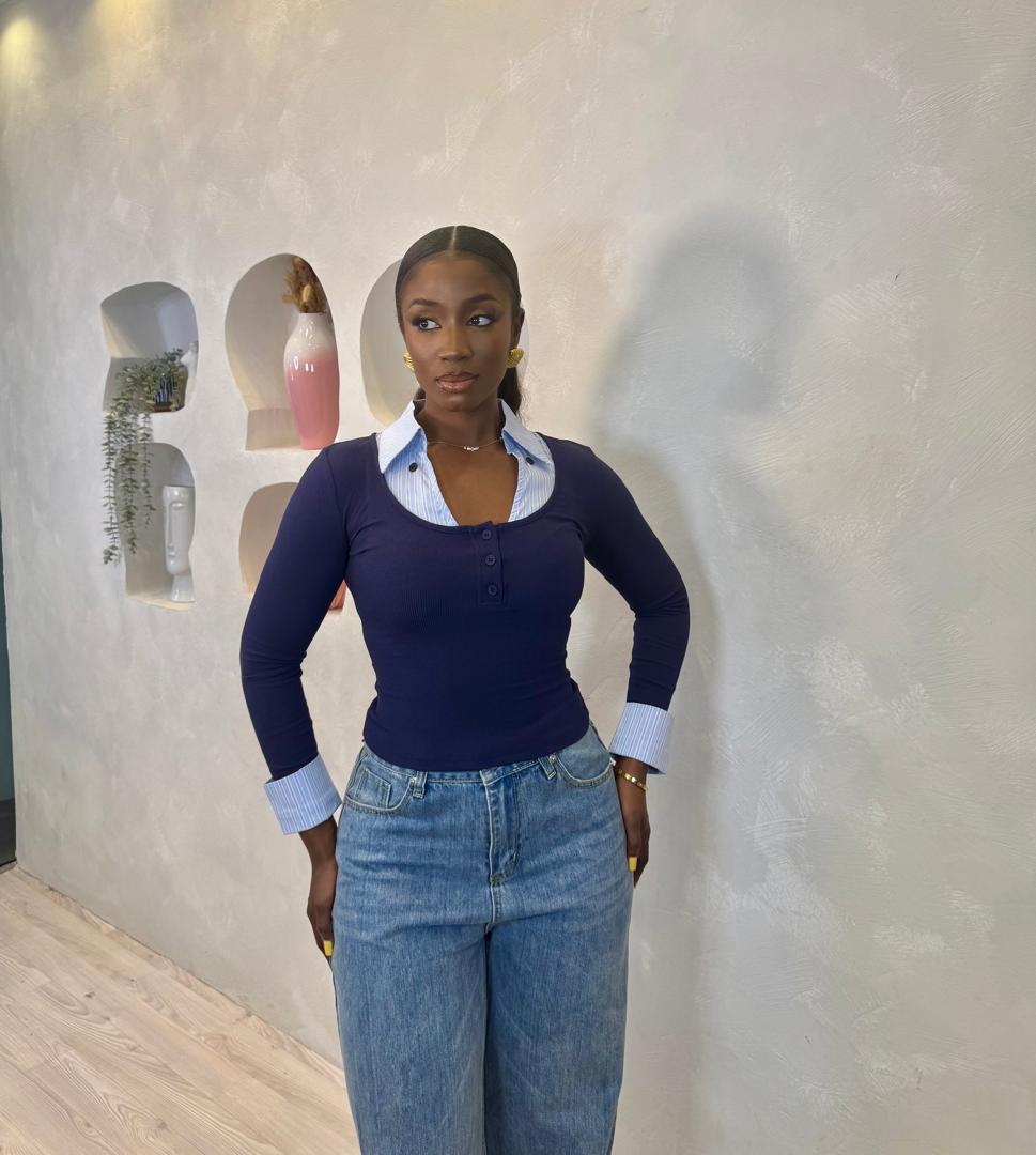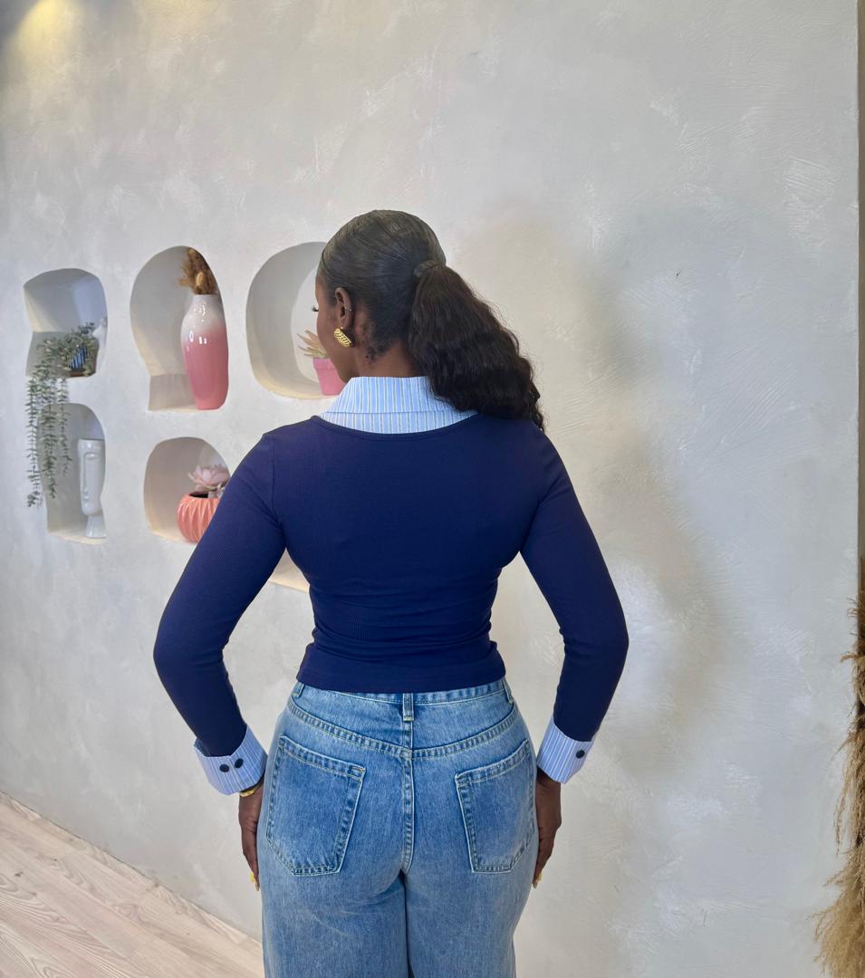 Featuring a navy ribbed knit base with a built-in light-blue shirt collar and cuffs, this top gives you that polished “styled for you” look without the extra effort. The button-front detail adds a touch of sophistication, while the fitted silhouette snatches the waist beautifully